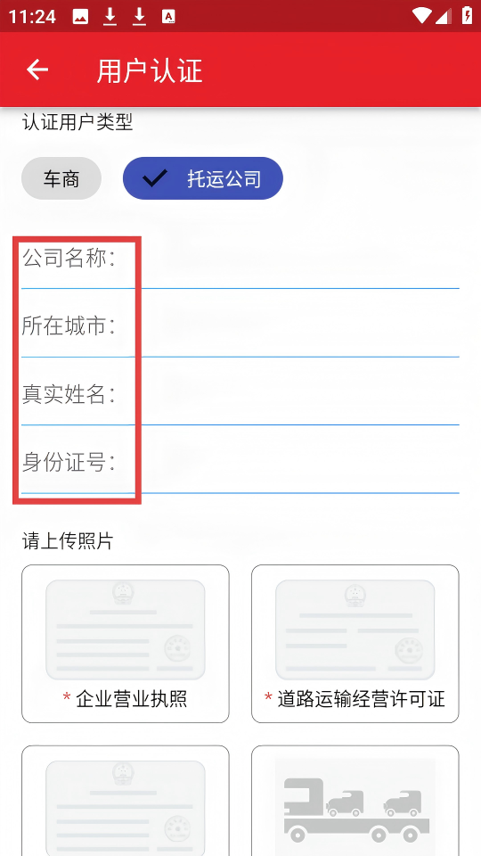 4、在【用户认证】页面,选择【托运公司】类型,填写【公司名称】【所在城市】等信息,并上传相关照片完成认证。