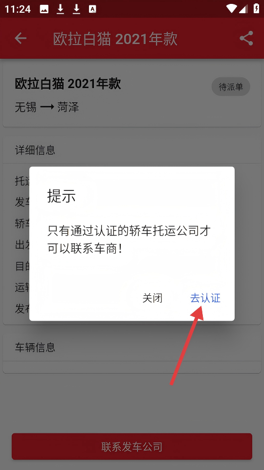 3、看到提示【只有通过认证的轿车托运公司才可以联系车商!】,点击【去认证】按钮。