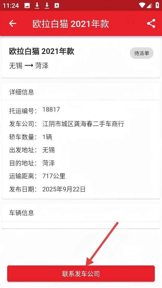 2、在【欧拉白猫2021年款】运车详情页,点击【联系发车公司】按钮。