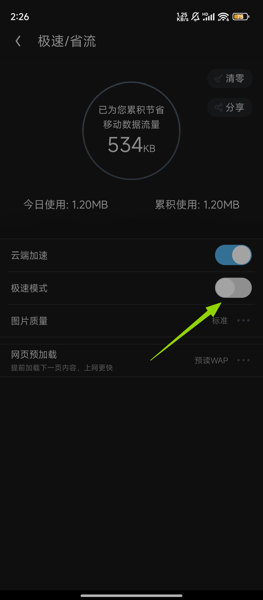 4、接着我们点击【极速模式】对应的开关,就能开启极速模式,让浏览更畅快啦。