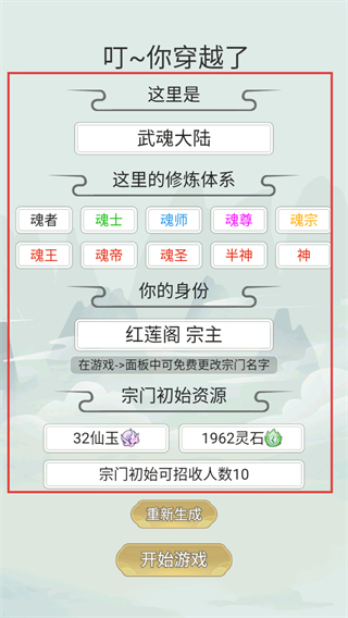 1、作为【红莲阁宗主】,初始拥有【32仙玉】-【1962灵石】,可招收10人,需合理规划资源开启宗门发展。
