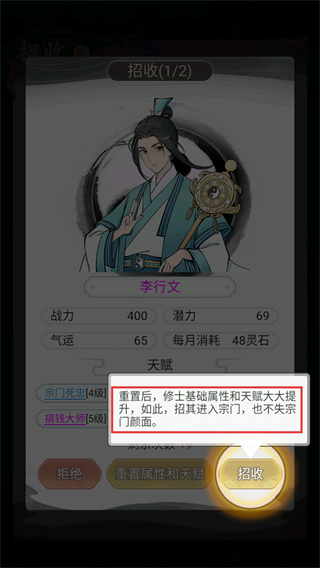 2、招收修士时,可通过【重置属性和天赋】提升【李行文】的基础属性与天赋,再纳入宗门增强实力。