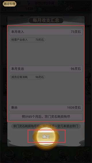 3、每月关注【收支汇总】,当前收入【73灵石】支出【96灵石】,需控制消耗避免【1939灵石】提前耗尽。