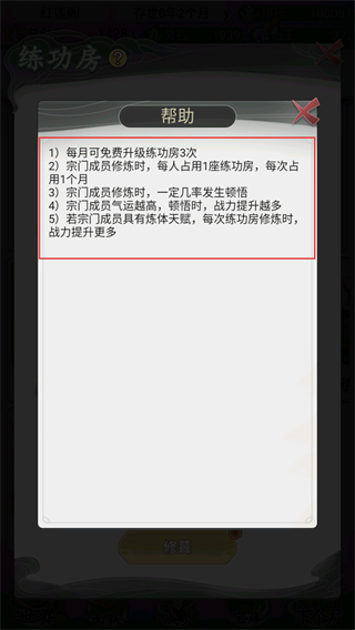 4、利用【练功房】每月免费升级3次的机会,安排气运高或有【炼体天赋】的成员修炼提升战力。