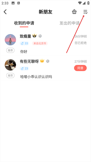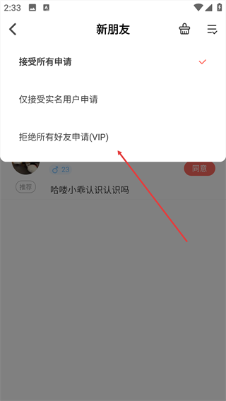 3、点击右上角的菜单按钮,弹出好友申请的批量处理选项菜单。