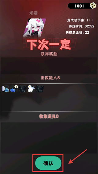 4、关卡结算后,查看总伤害等数据,点击【确认】领取奖励,积累资源用于角色强化。