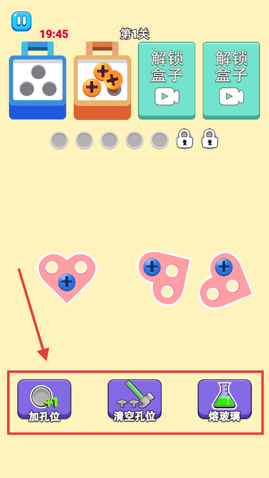1、把握方块拆除细节,拆掉所有螺丝完成消除过关,就能获得丰富资源道具与金币,推进进度。