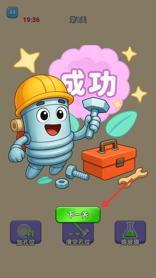 4、关卡成功后点击【下一关】按钮,继续挑战新的螺丝消除关卡,准备规划新的消除策略。