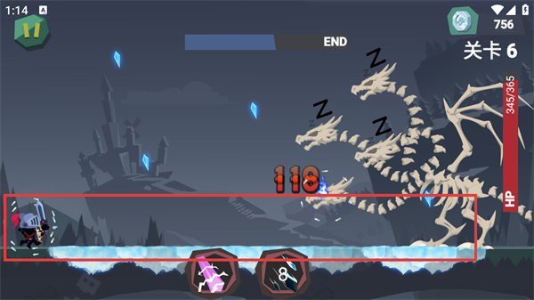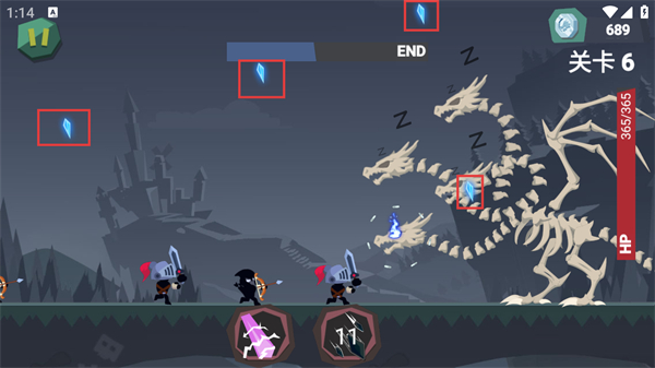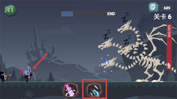 1、在关卡6中,点击红色框内的蓝色技能区域,释放技能攻击敌人。