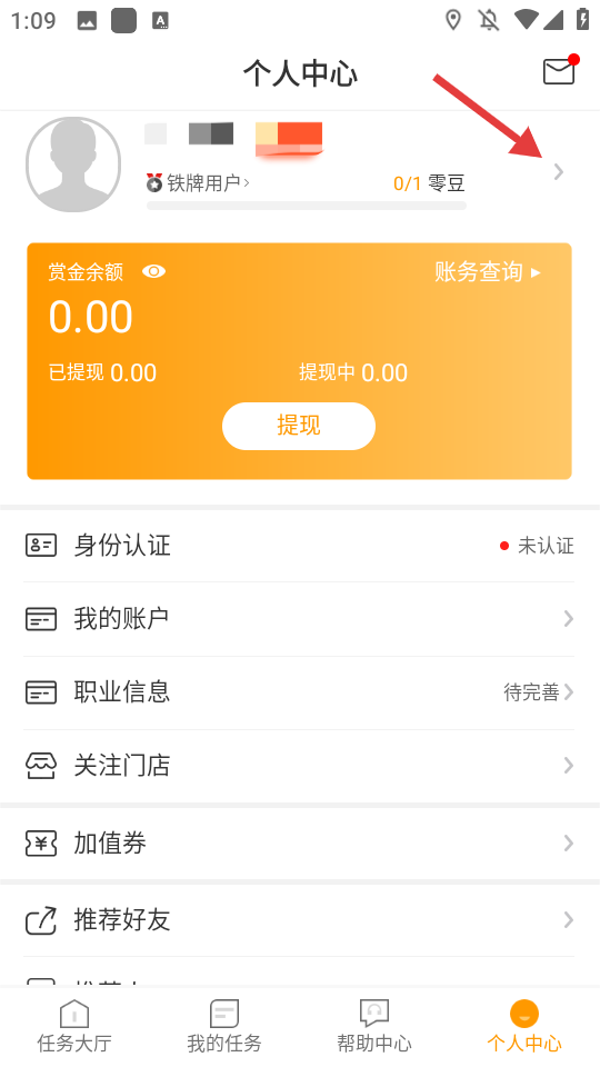 2、在个人中心点击头像旁的箭头,进入修改资料页面。