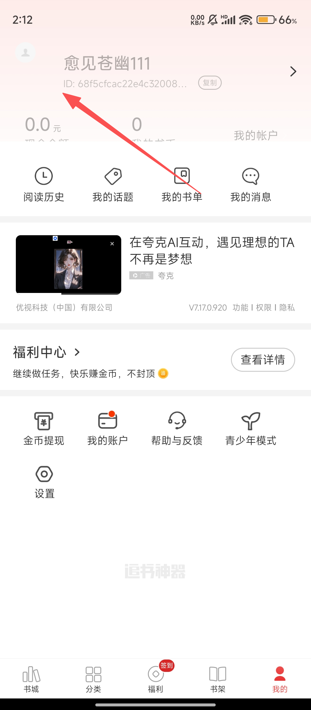 1、打开追书神器的【我的】页面,点击头像旁的ID区域,进入个人信息页面哦。