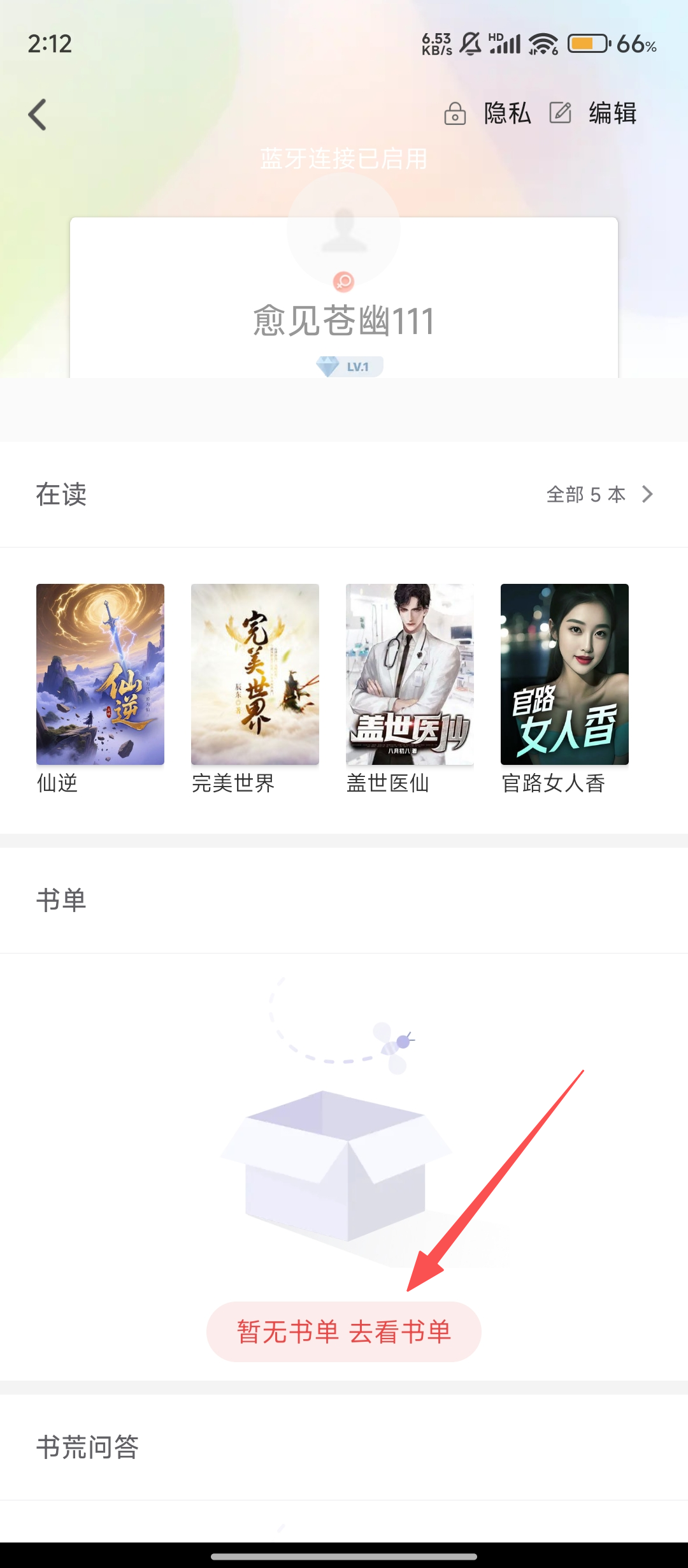 2、在个人信息页面,看到【暂无书单-去看书单】按钮就点击,进入主题书单页面啦。