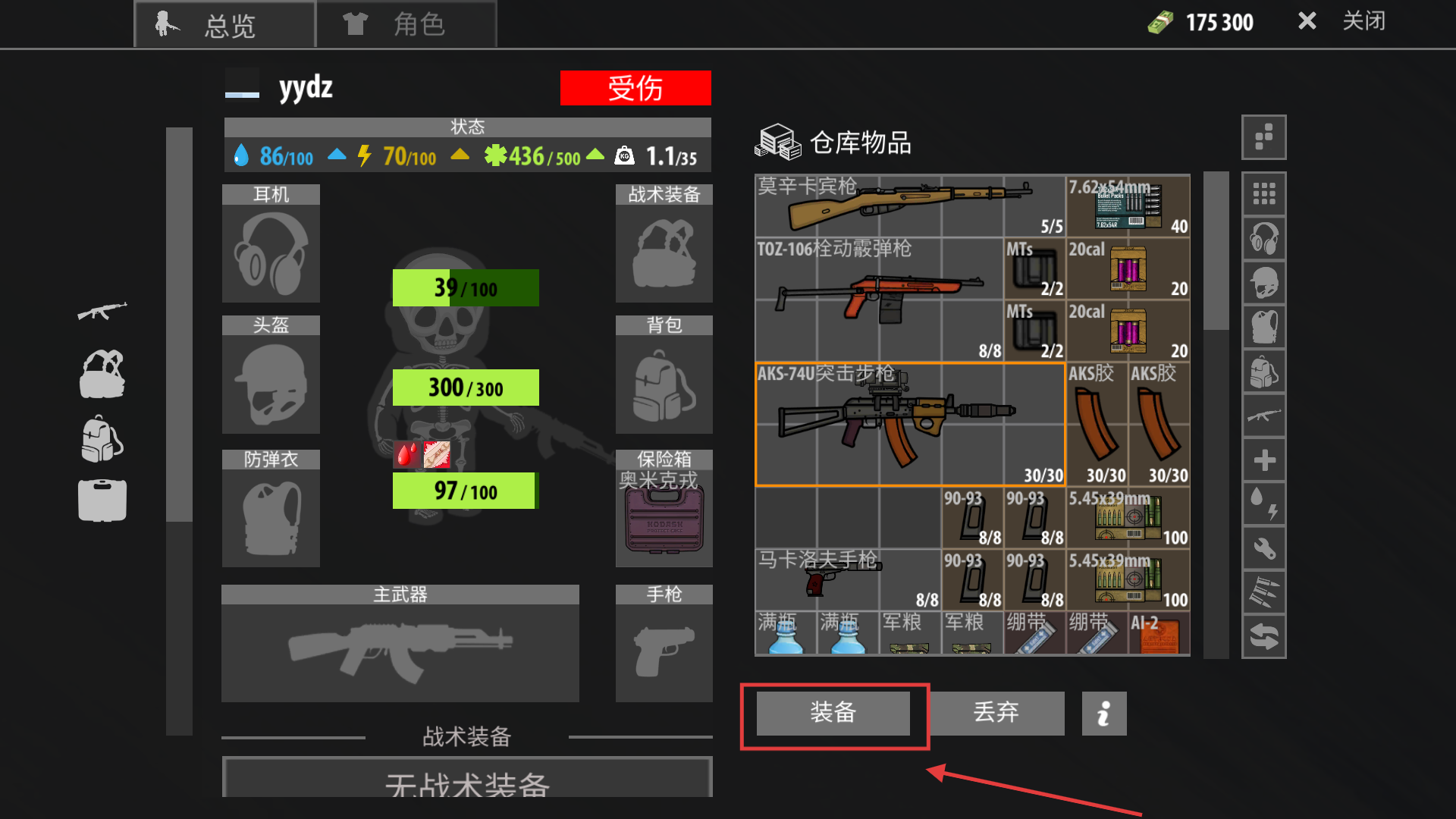 1、在仓库界面选中【AKS-74U突击步枪】,点击装备按钮武装角色,为后续战斗做好武器准备。