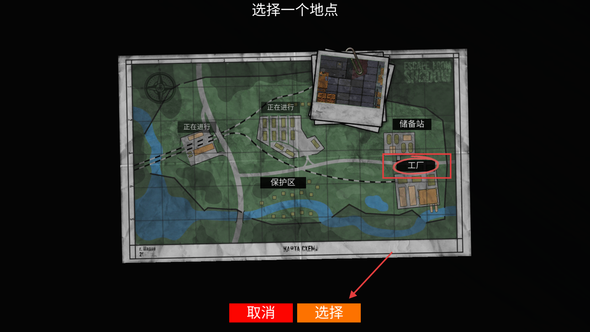 2、在地图选择界面点击标记的【工厂】区域,再点击选择按钮,进入该副本开启生存挑战。