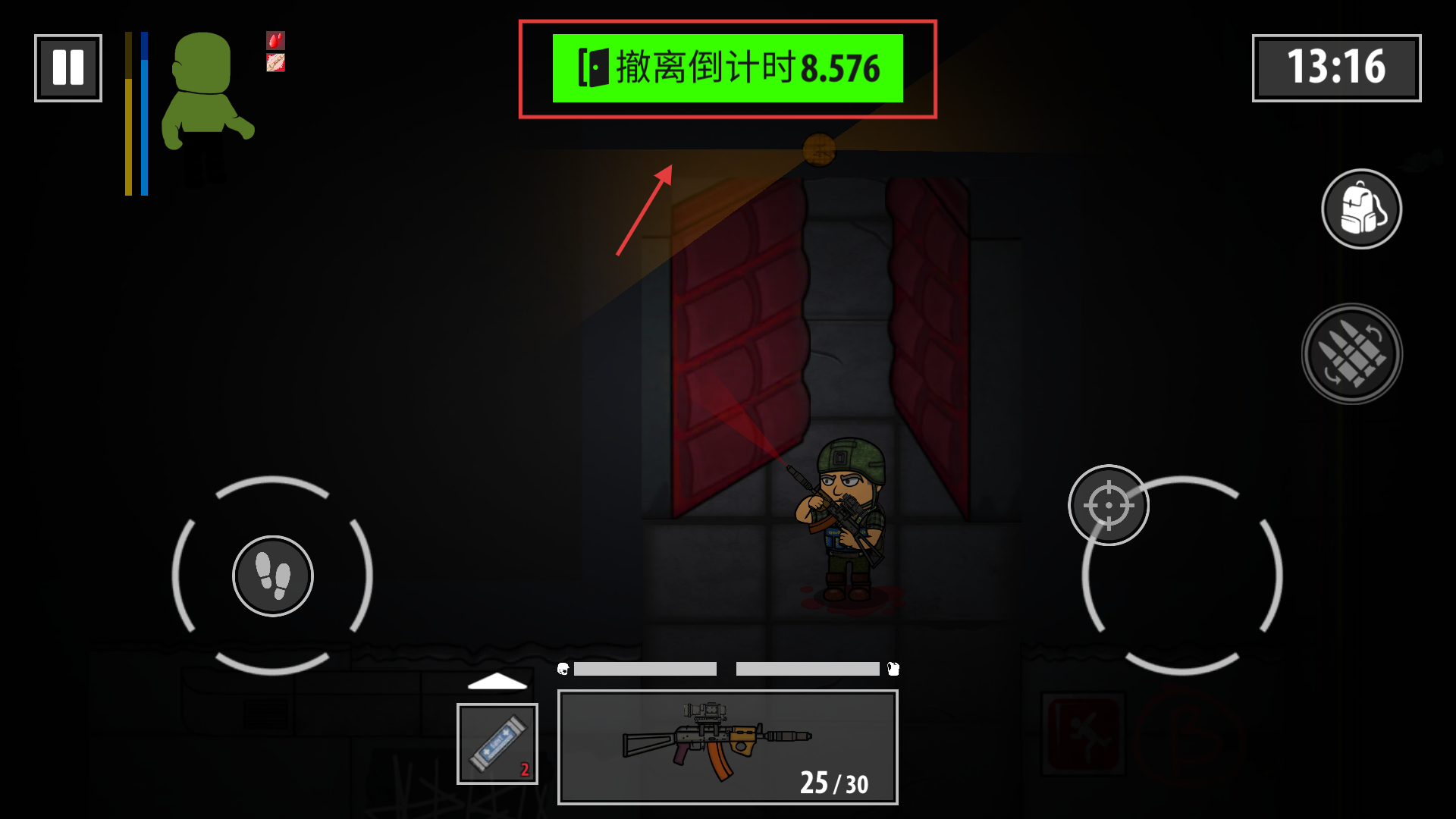 4、战斗中留意顶部的【撤离倒计时】,规划行动路线及时撤离,确保生存并保留物资。