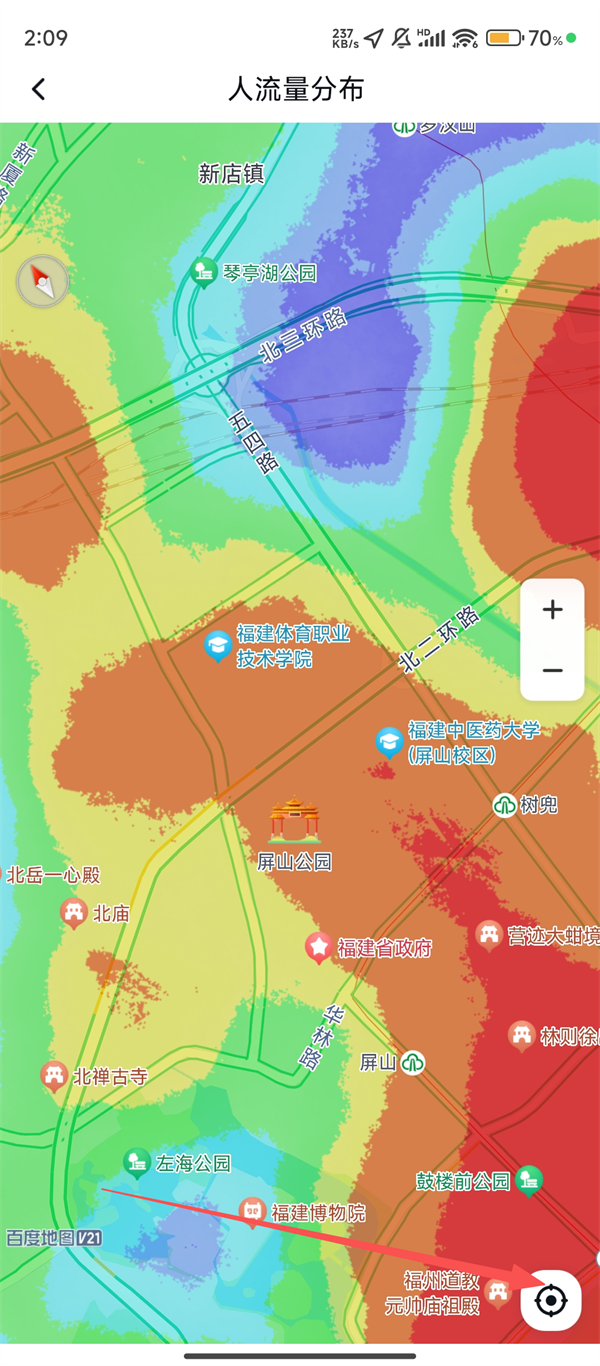 4、点击右下角的定位按钮,能快速定位到自身位置的热力分布,助力我们避开人流密集区域,轻松出行啦。
