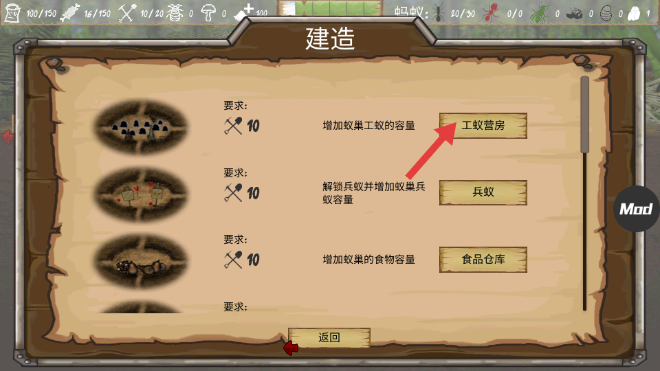 4、在建造界面点击【工蚁营房】,满足要求后建造,增加蚁巢工蚁的容量,提升蚂蚁族群实力。