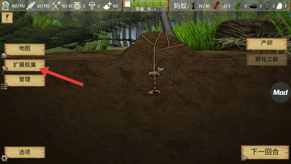 2、点击【扩展蚁巢】,开始对蚁巢进行扩展,为蚂蚁的生存和发展创造空间。