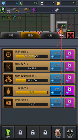 1、在普通任务界面,完成进行时间、消灭敌人等任务目标,可获取钻石等资源奖励,资源用于后续僵尸养成与功能解锁。