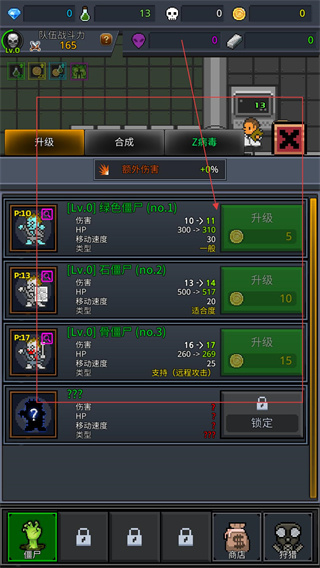 3、还可进入“升级”界面,消耗金币提升僵尸的等级,等级提升会增强僵尸的伤害、血量等属性,提升队伍整体战斗力。