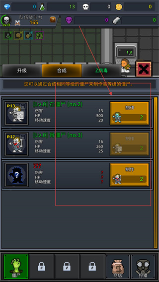 2、玩家需要持续通过下方的“制作”功能生成基础僵尸,填充场地的同时积累合成素材,为高阶僵尸的合成提供基础单位。