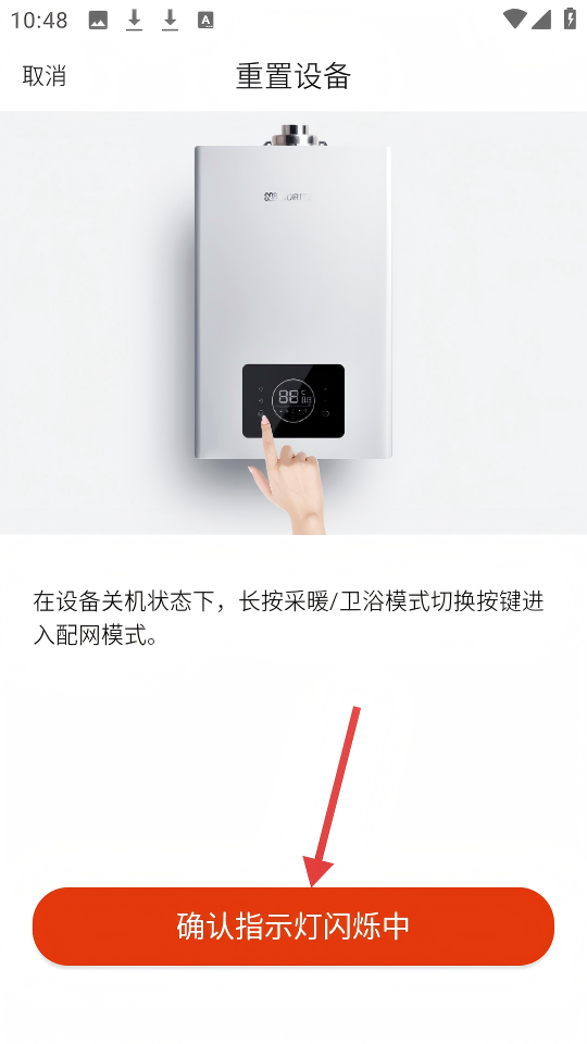 4、在设备关机状态下长按采暖/卫浴模式切换按键进入配网模式后,点击【确认指示灯闪烁中】按钮。