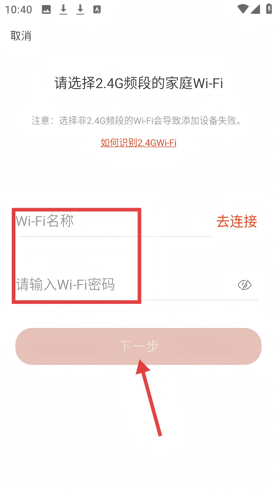 3、选择2.4G频段的家庭Wi-Fi,输入【Wi-Fi名称】和【请输入Wi-Fi密码】,点击【下一步】按钮。