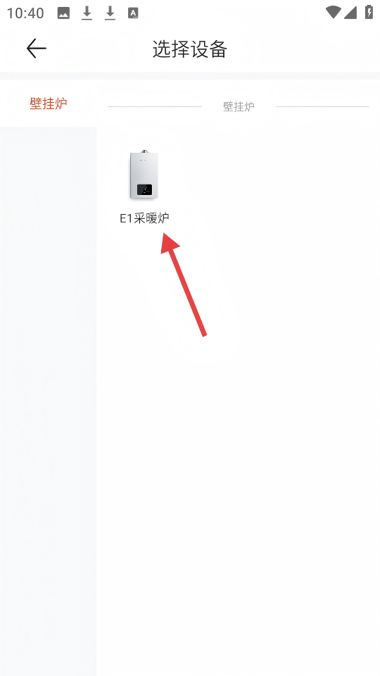 2、在【选择设备】页面的壁挂炉分类下,点击【E1采暖炉】进行设备选择。