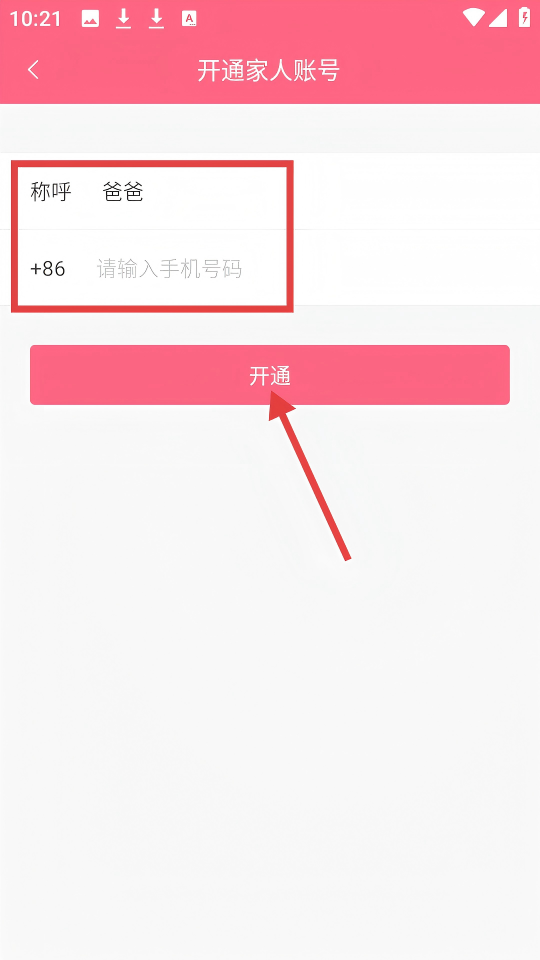4、在【开通家人账号】页面,填写称呼【爸爸】及手机号码后,点击【开通】按钮。