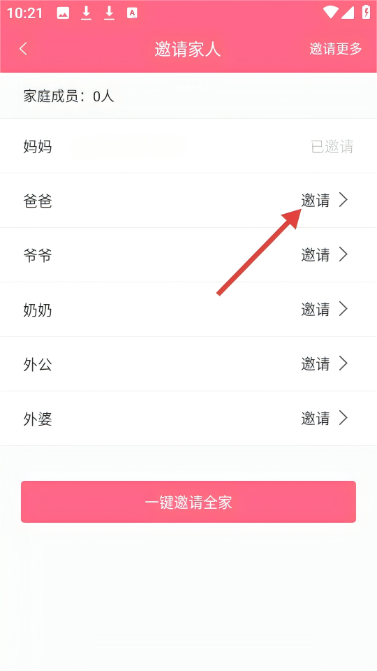 3、在【邀请家人】页面,点击【爸爸】右侧的【邀请】按钮,邀请爸爸。