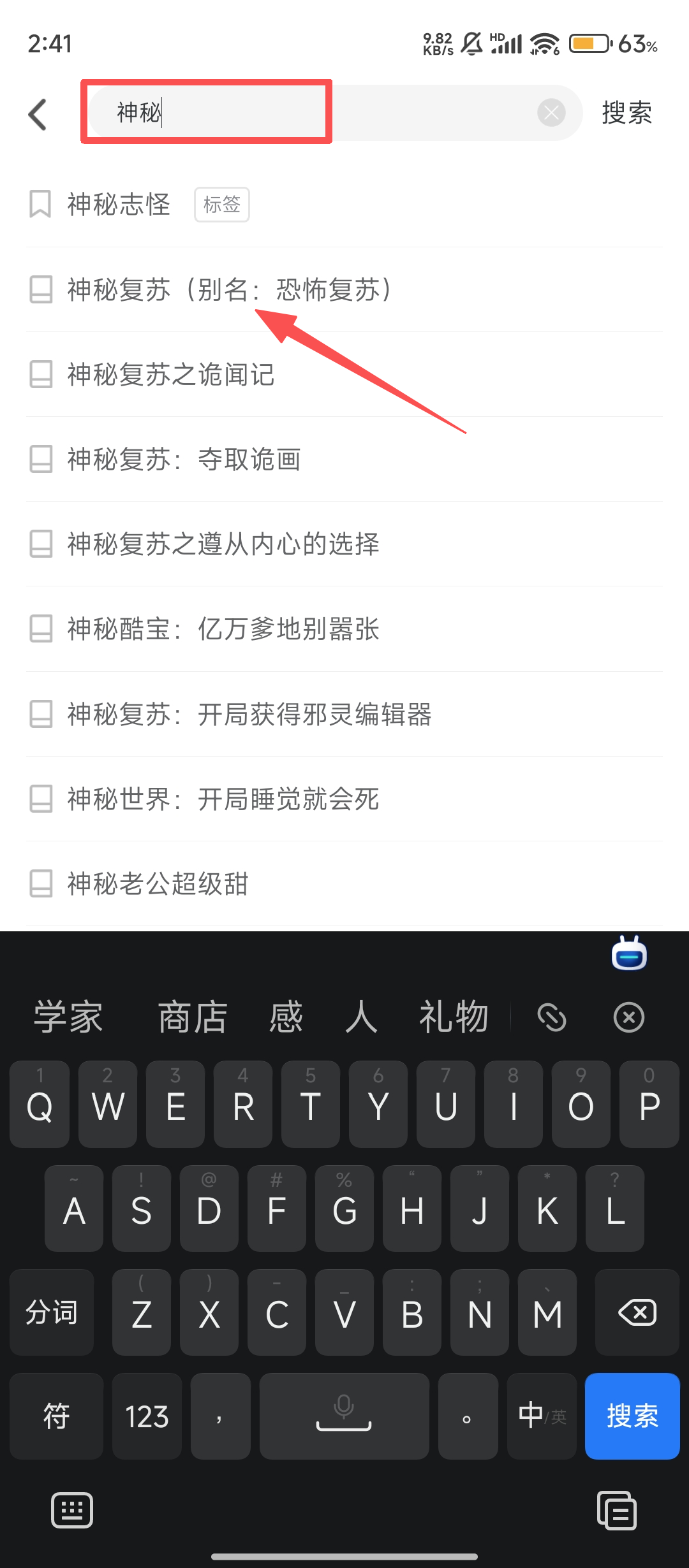 2、若想找特定小说,在搜索框输入关键词,比如【神秘】,会弹出相关推荐,像【神秘复苏】,选它就对啦。
