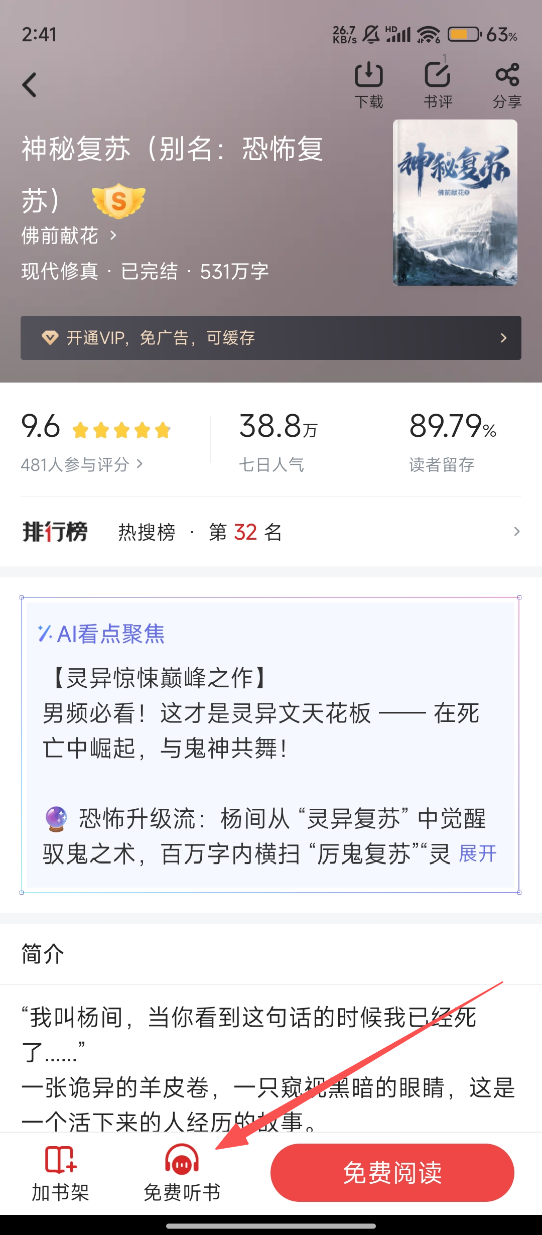 3、关键词搜索完后可以进入详情页,之后可以选择【免费听书】,用听书的方式适合忙碌时哦。