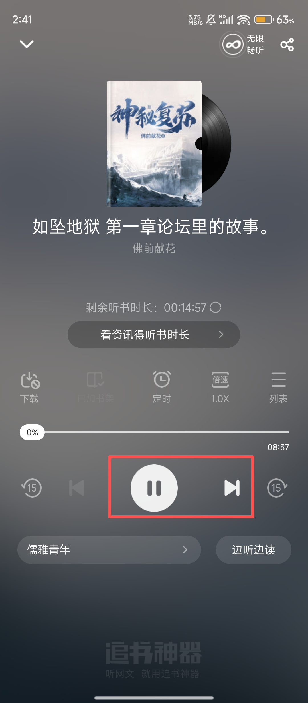 4、进入听书界面,能看到播放控制栏,可暂停、切换章节等,听书体验相当丰富呢。