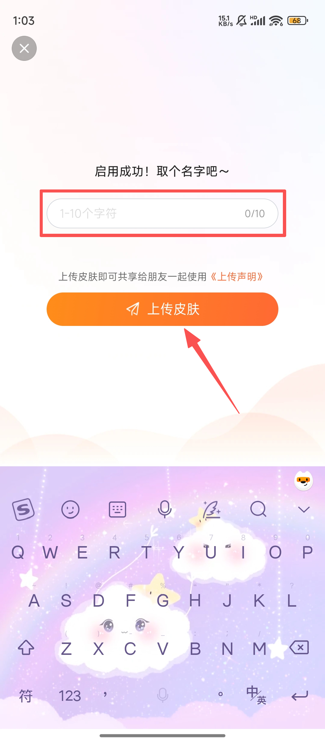 4、皮肤启用成功后,在输入框里给它取个1-10个字符的名字,还能点击【上传皮肤】,把皮肤分享给朋友们一起用呢。
