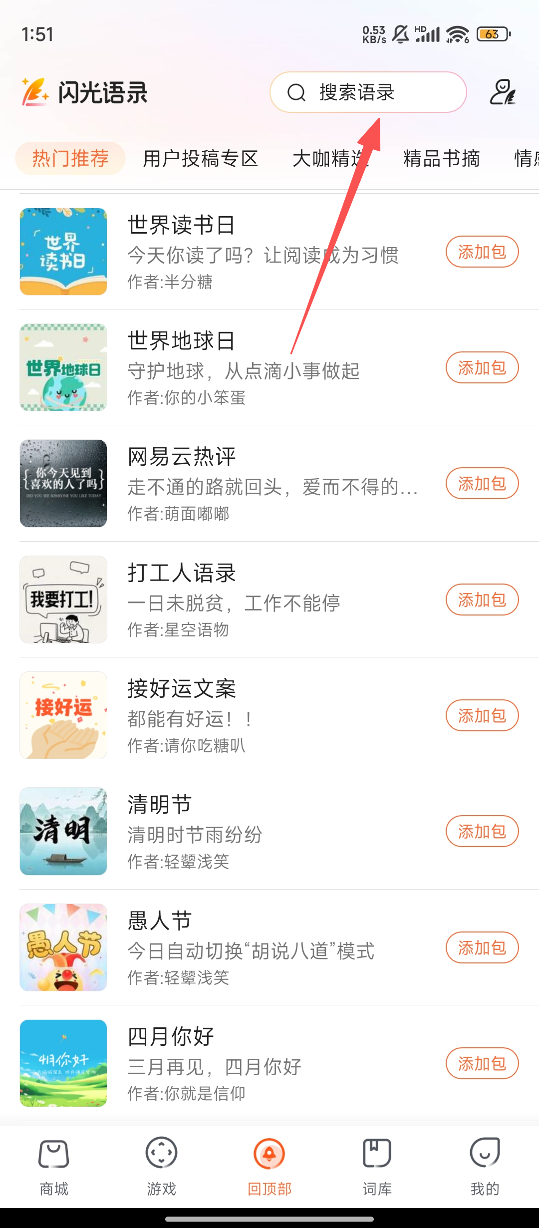 2、进入【闪光语录】页面后,在顶部的【搜索语录】输入框里,输入想找的语录关键词哦。