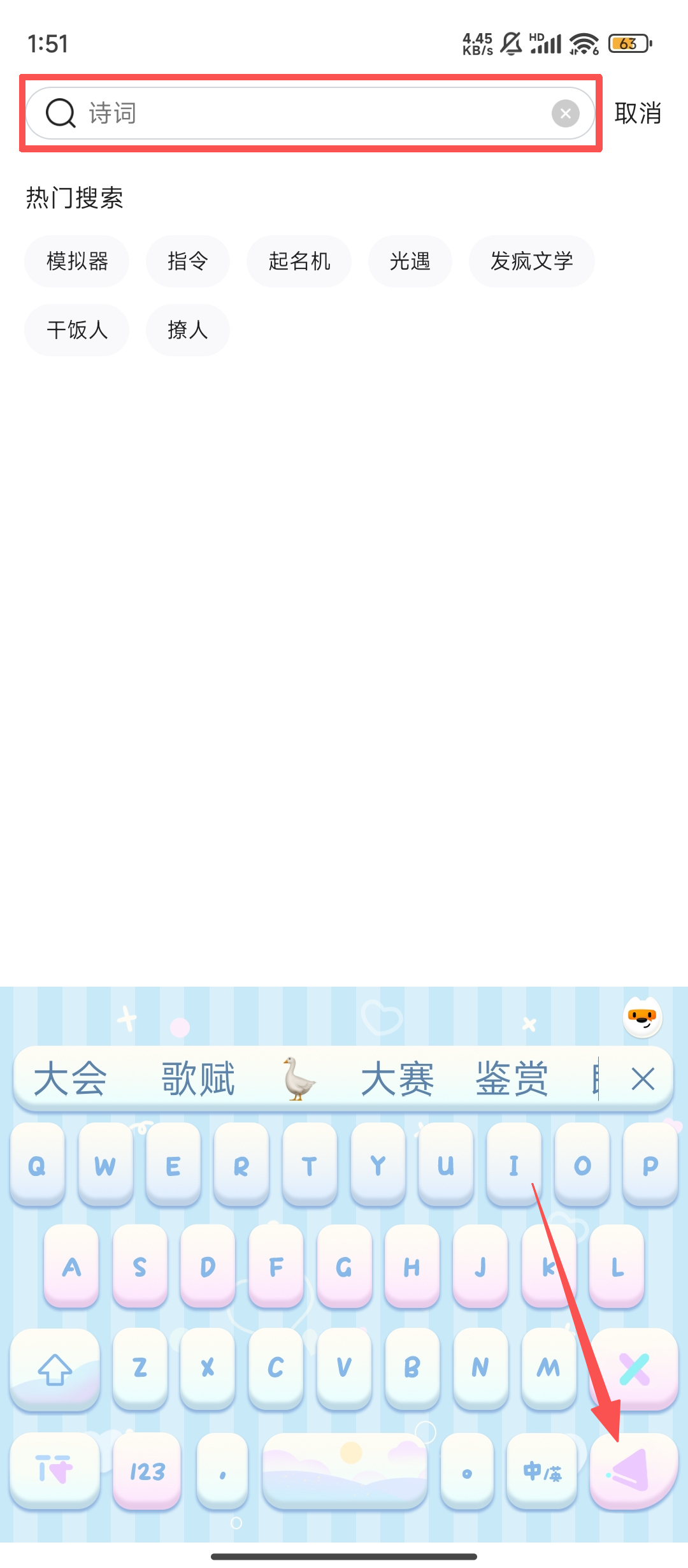 3、输入关键词后,点击键盘上的确认键,这样就能触发搜索,看到相关的语录内容啦。