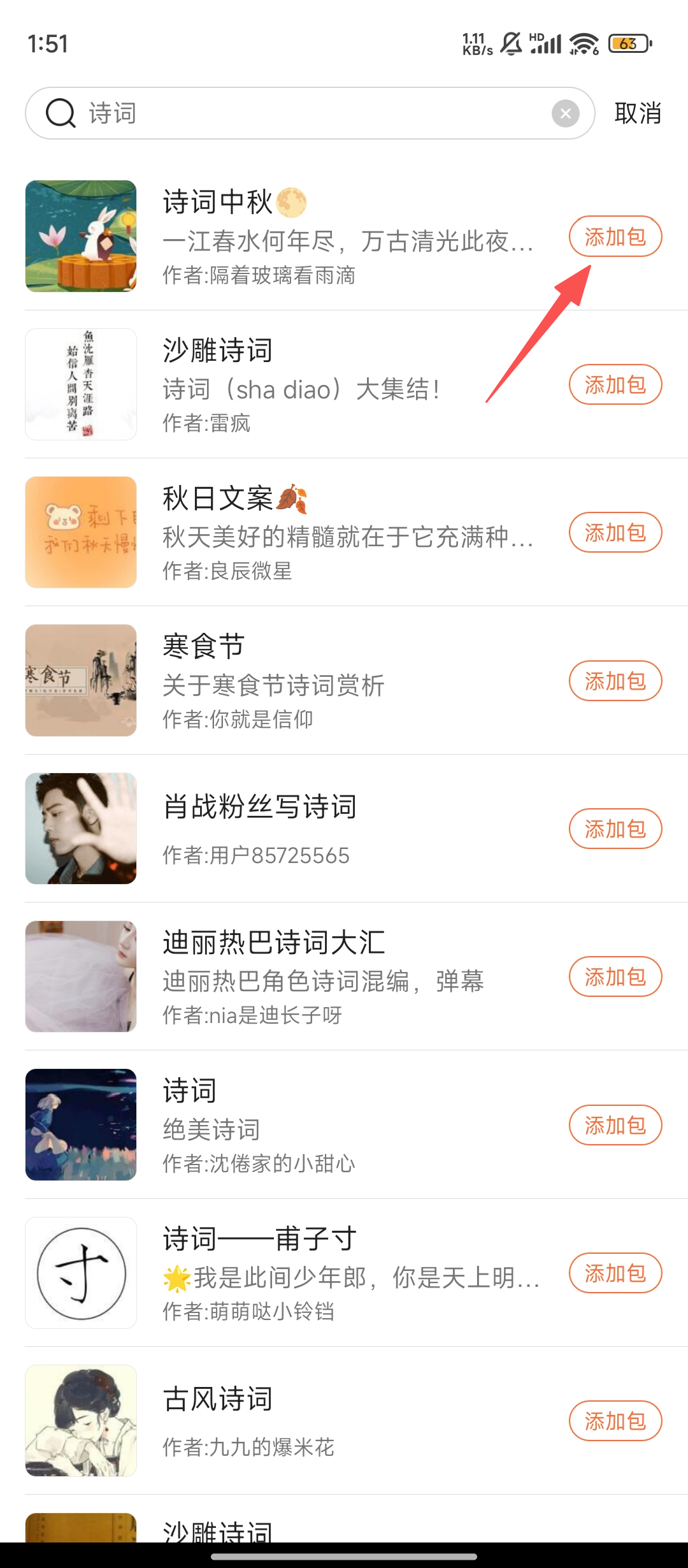 4、在搜索结果里,找到喜欢的语录包,点击它旁边的【添加包】按钮,就能把这个语录包添加到输入法中哦。