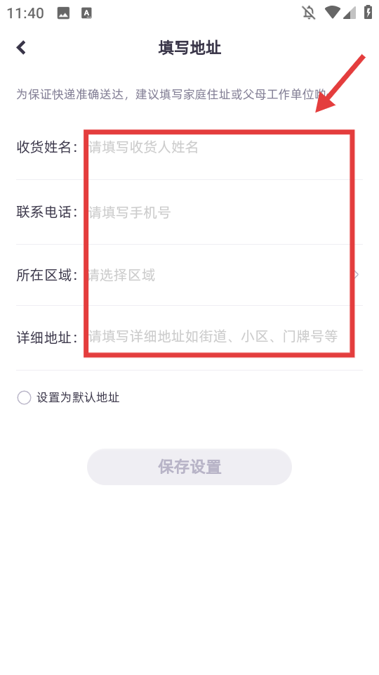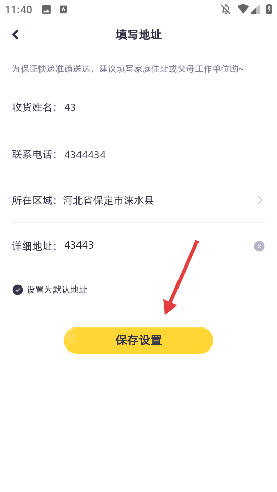 4、信息填写完成后,点击【保存设置】按钮,完成收货地址设置。