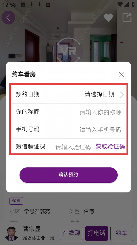 4、在约车看房弹窗中,填写信息后,可完成约车看房预约。