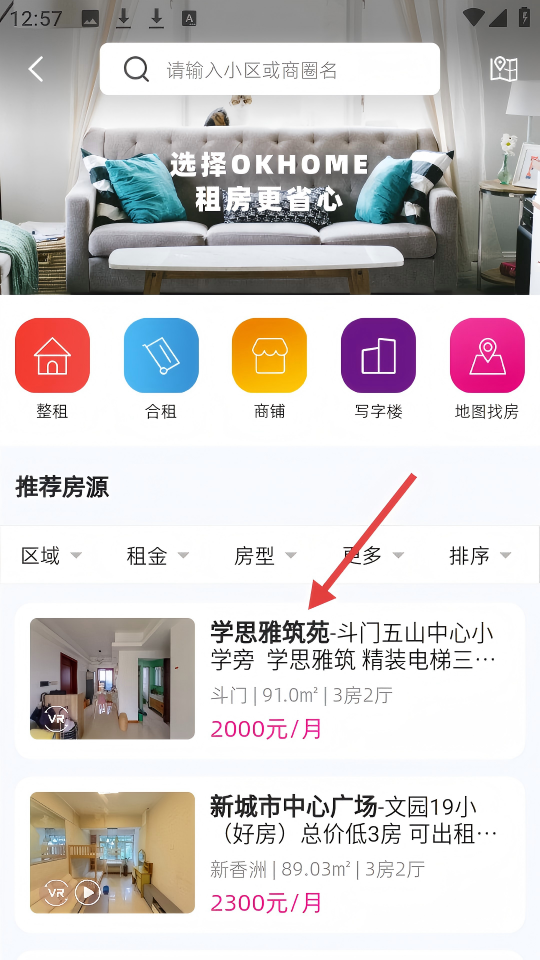 2、在租房页面,点击推荐房源【学思雅筑苑…】,可进入该房源的详情页面。