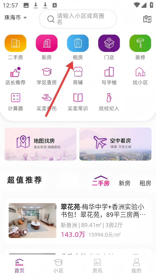 1、在首页点击【租房】选项,可进入租房页面。