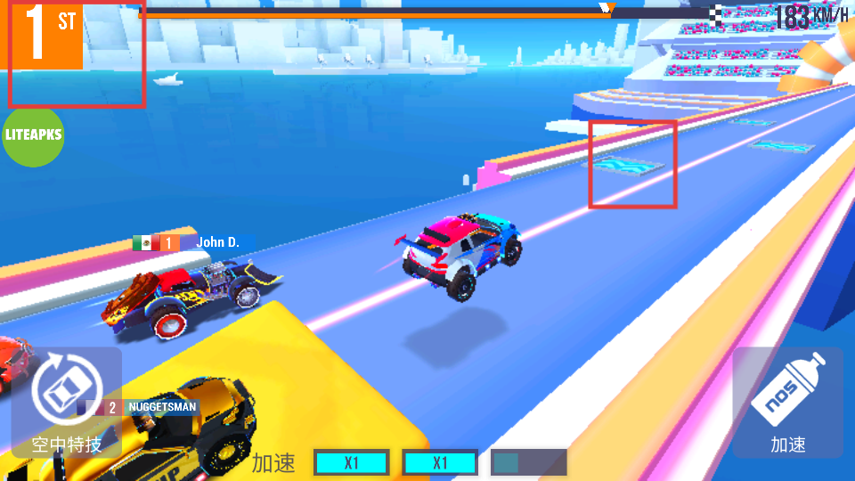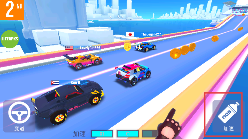 3、点击【nos加速】按钮,使用加速道具,提升赛车速度。