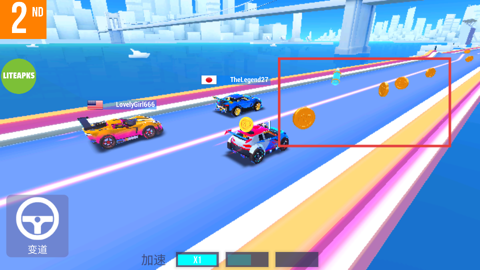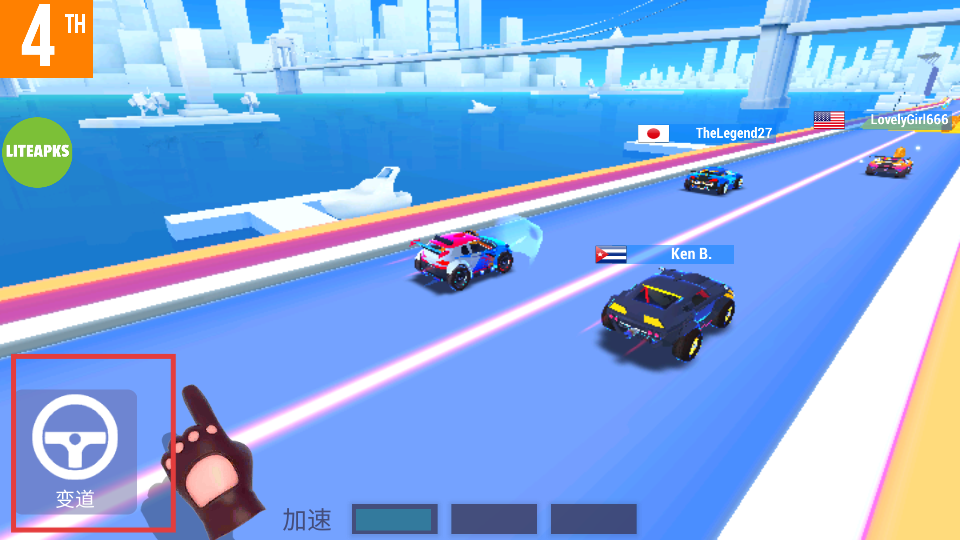 1、使用【变道】功能,调整赛车位置,在赛道上灵活行驶。