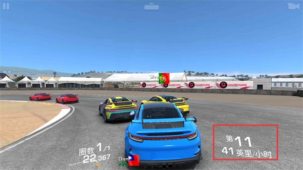 1、观察界面显示的【圈数1/1-22.367】与【第11-41英里/小时】,操控车辆保持行驶节奏,紧跟前车。
