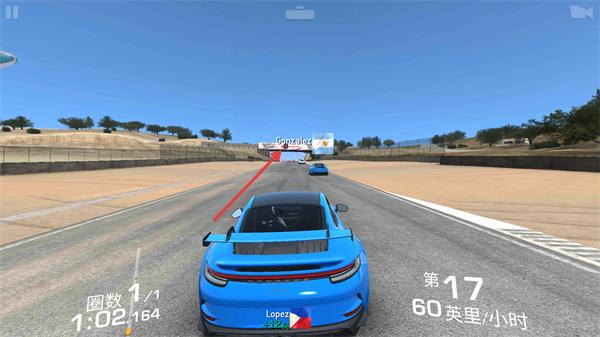 4、按照赛道路线操控车辆,观察【圈数1/1-1:02.164】与【第17-60英里/小时】,稳定推进赛程。