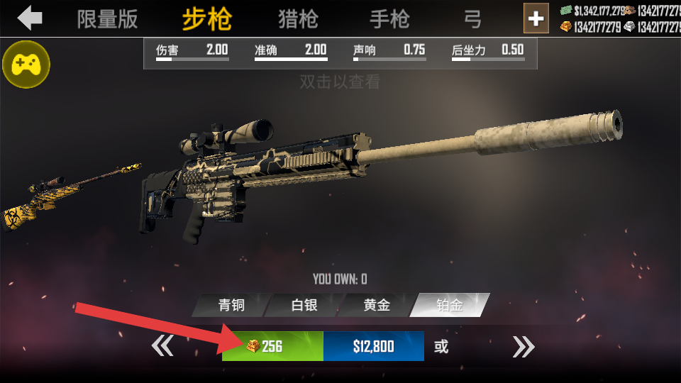 2、进入商店后,利用无限金币优势,可选择花费256金币等购买强力步枪,提升狩猎能力。