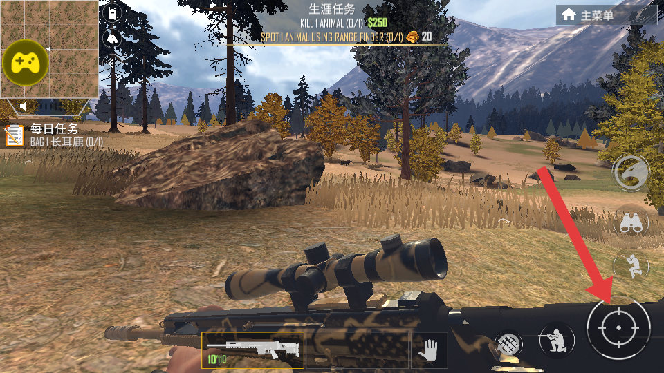 3、装备好枪械后,进入狩猎场景,发现猎物后点击右侧瞄准图标进入瞄准模式。