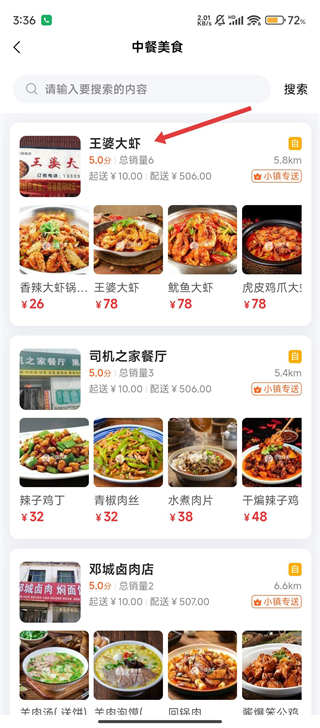 2、在中餐美食列表中,我们选择【王婆大虾】店铺,就能看到各类美味大虾菜品啦。