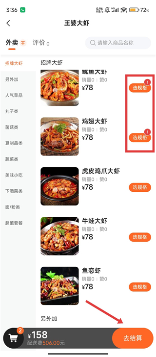 3、进入店铺后,我们选好菜品规格,点击【去结算】,进入订单确认环节哦。
