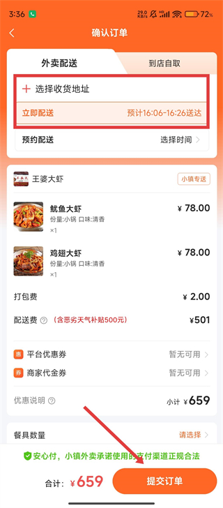 4、最后我们选择收货地址,确定立即配送,点击【提交订单】就能完成点餐啦。